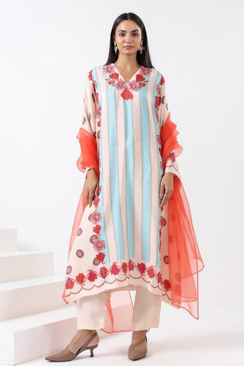 Detailing : Gorgeous aqua V-neck straight kurta, paired with pants and organza dupatta.