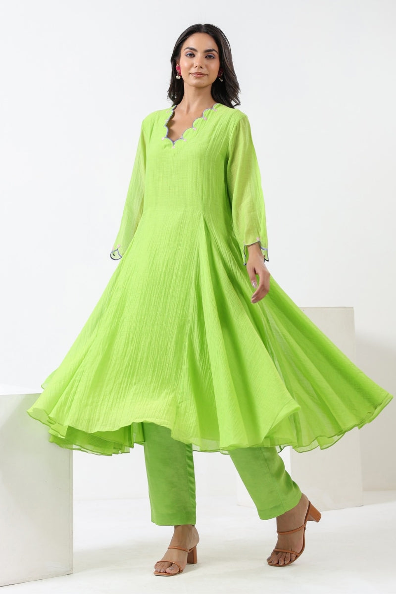 The lime green neckline detailed dress embodies very modish scallop finish on neckline and at sleeves. comes with slip.
